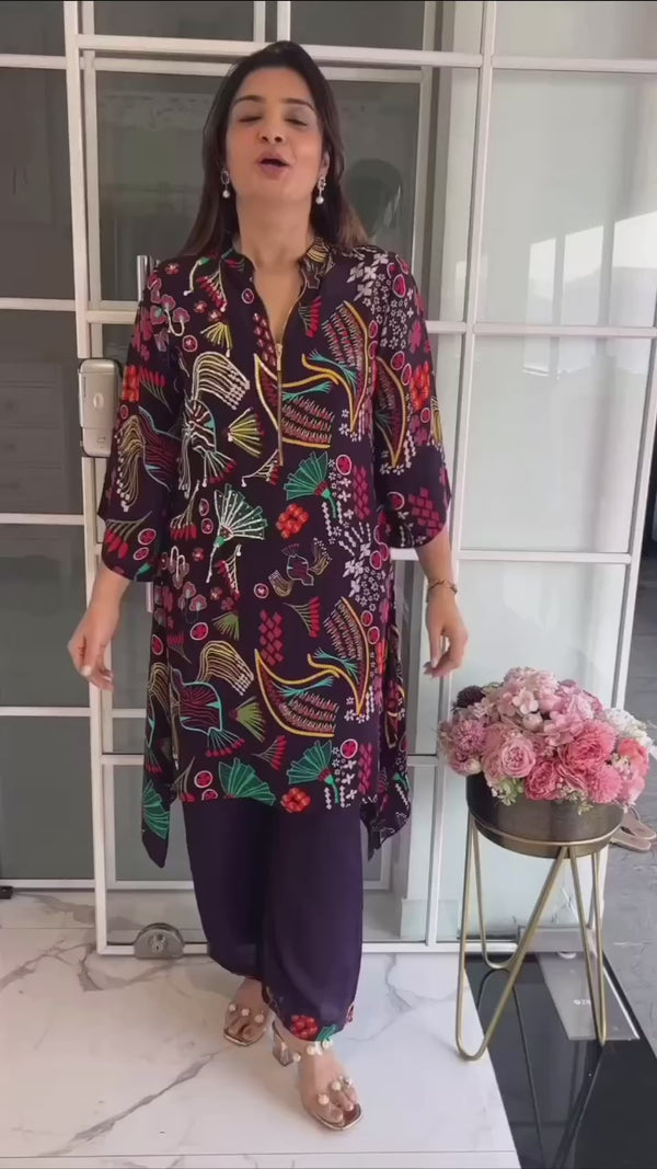Introducing our Impressionist - A pure muslin silk kurta and pant set showcasing exquisite strokes reminiscent of a painted masterpiece. The neckline boasts a sophisticated zipper adorned with elegant sequence work stitching on the print. The pants are plan. Get ready to turn heads with this impeccably matched and stunning outfit.